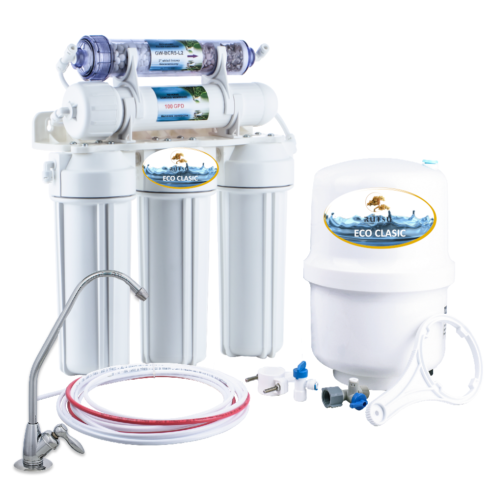 System Rutsu ECO CLASIC został zaprojektowany dla klientów chcących mieć w swoim domu lub firmie czystą, orzeźwiającą wodę pozbawioną zanieczyszczeń mechanicznych, związków metali ciężkich oraz związków chemicznych. System zapewnia oczyszczenie wody technologią nanofiltracji z użyciem komponentów o najwyższej jakości powstałej z połączenia polskiej produkcji i najnowszej koreańskiej technologii. Cały system łączy w sobie pięć etapów uzdatniania wody nie pozbawiając jej minerałów. System jest podłączony do ujęcia wody, zapewnia odcięcie zasilania po napełnieniu zbiornika.